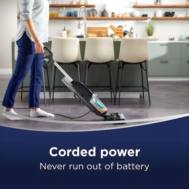 چون دستگاه سیمی (corded) است، نیازی به شارژ مجدد ندارد. قدرت مکش در تمام مدت ثابت میماند و میتواند حتی لکهها و رطوبت سطحی را کاملاً جمع کند.