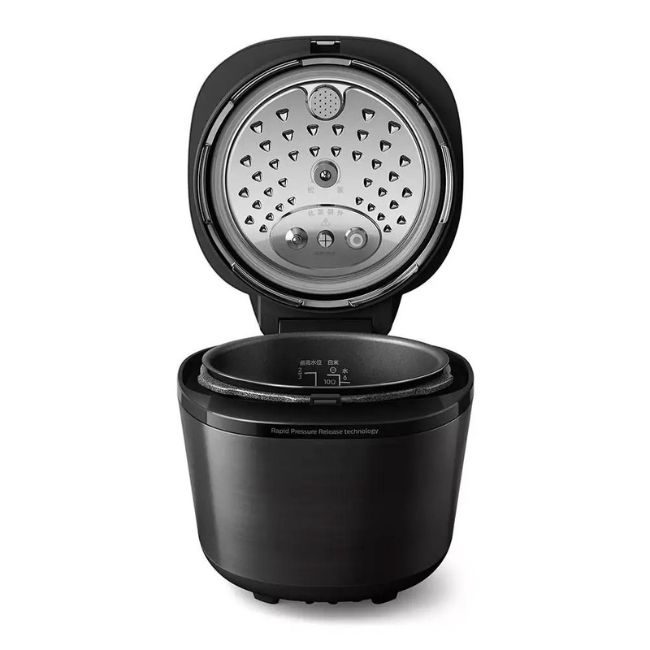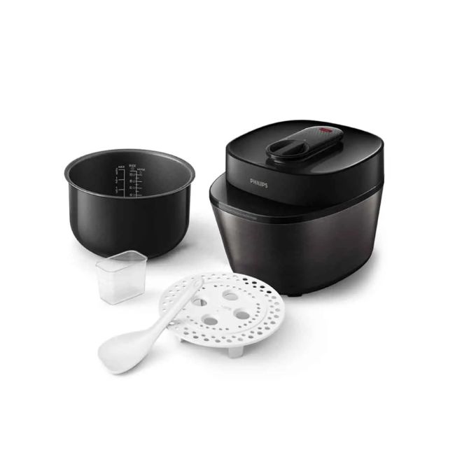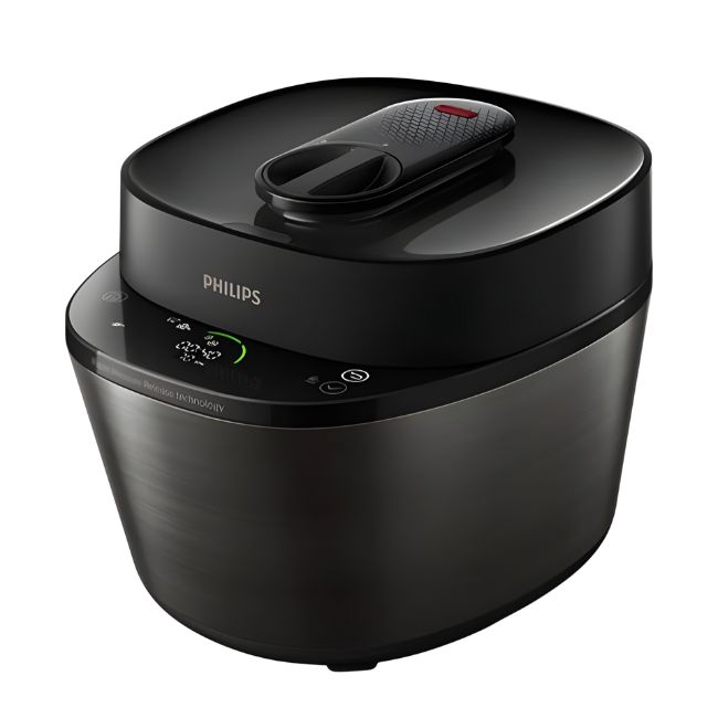 این محصول با طراحی مدرن و کاربرپسند عرضه شده است که هم زیبایی و هم کارایی را در آشپزخانه ترکیب میکند. بدنهی آن از جنس پلاستیک مقاوم و استیل ضدزنگ ساخته شده و رنگبندی مشکی–نقرهای جلوهای شیک و هماهنگ با دکور آشپزخانههای امروزی دارد. پنل جلویی دستگاه به یک نمایشگر LED دیجیتال و دکمههای لمسی مجهز است که کار با برنامههای مختلف را ساده و سریع میسازد. درب دستگاه بهصورت قفل ایمنی طراحی شده و دستگیرهی مقاوم آن باز و بسته کردن را آسان میکند. همچنین طراحی جمعوجور و ظرفیت ۵ لیتری باعث میشود برای خانوادههای متوسط تا بزرگ مناسب باشد، بدون اینکه فضای زیادی از آشپزخانه اشغال کند. ترکیب خطوط ساده، نمایشگر مدرن و بدنهی مقاوم، HD2151 را به یک وسیلهی زیبا و کاربردی در دنیای آشپزی مدرن تبدیل کرده است.